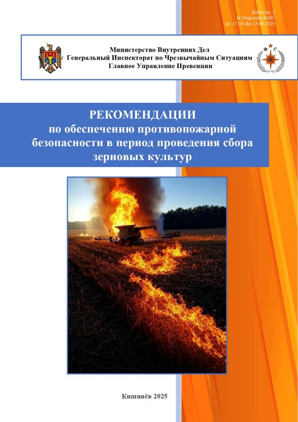 В целях недопущения случаев возникновения пожаров на зерновых участках, в местах хранения и переработки зерновых культур, а также минимизации риска возникновения чрезвычайных ситуаций в период сбора урожая, Генеральный Инспекторат по Чрезвычайным Ситуациям, в целях обеспечения высокого уровня безопасности, рекомендует строго соблюдать требования положений и правил противопожарной защиты.