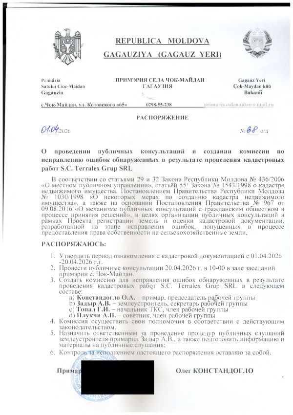 Согласно Распоряжения №68 от 1 апреля 2026 года примэрия с. Чок-Майдан проводит публичные слушания с 01.04.2026 по 20.04.2026 года по исправлению ошибок по программе «Pămȃnt».