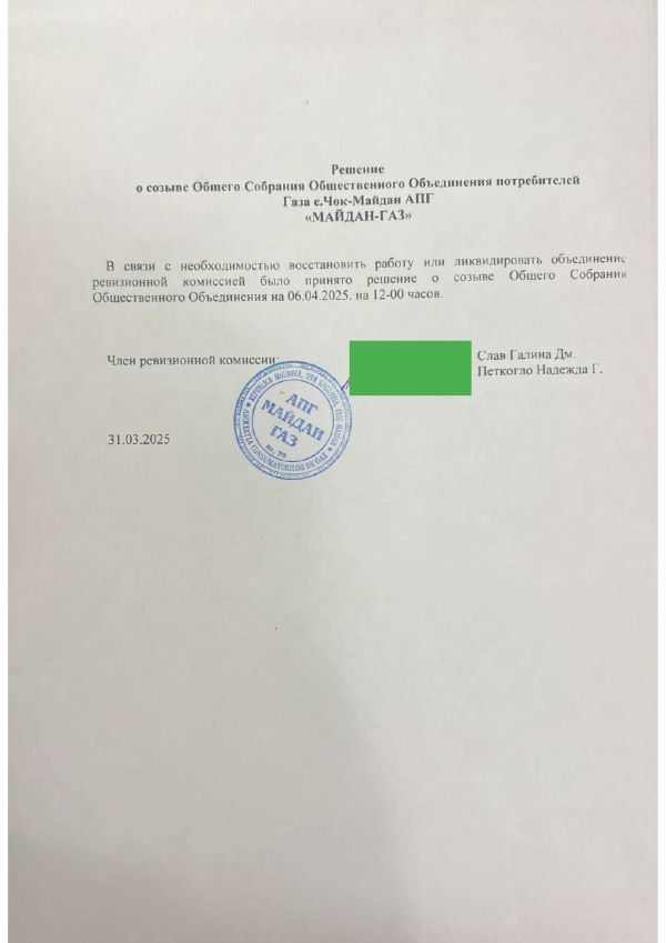 В связи с необходимостью восстановить работу или ликвидировать объединение, ревизионной комиссией было принято решение о созыве Общего Собрания Общественного Объединения потребителей Газа с.Чок-Майдан АПГ «МАЙДАН-ГАЗ», которое состоится в актовом зале лицея 6 апреля в 12:00 часов.