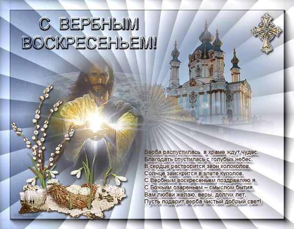 Поздравляем всех с этим светлым и радостным днем Входа Господня в Иерусалим! Пусть этот день наполнит ваш дом светом, радостью и благодатью. Желаем вам и вашим близким крепкого здоровья, мира в душе и благополучия. Пусть освященная верба принесет в ваш дом защиту от всех невзгод и наполнит его весенним теплом и любовью, пусть праздничный звон колоколов унесёт все неприятности, а в дом входят только счастье и благополучие.