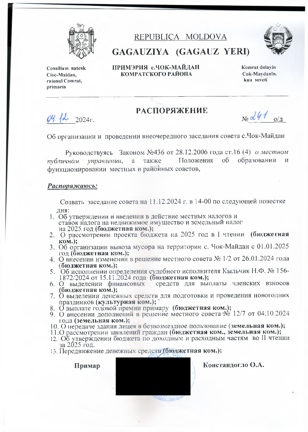Уважаемые односельчане! Оповещаем Вас о том, что Руководствуясь Законом No436 от 28.12.2006 года ст.16 (4) о местном публичном управлении, а также Положения об образовании и функционировании местных и районных советов, проведется внеочередное заседание совета на 11.12.2024 г. в 14-00 по следующей повестке дня: